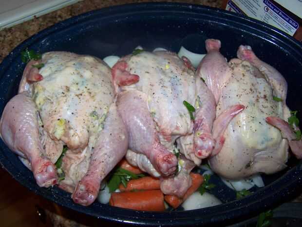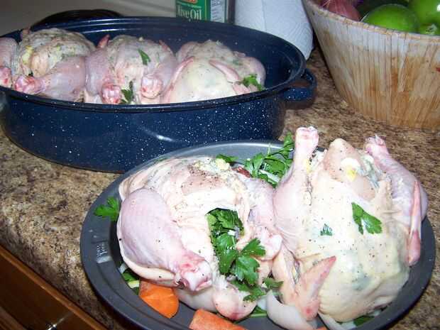 Usando sus dedos y un pequeño, agudo cuchillo, aflojar la piel de los senos y los muslos de pollo. Mezcla de la mantequilla del resbalón entre piel y carne, extendiendo uniformemente. Frote la piel con aceite; piel de temporada y de la cavidad con sal y pimienta al gusto. Cosas con limón en cuartos, perejil y 1 cebolla en cuartos. Atar las patas con hilo de cocina, si quieres.