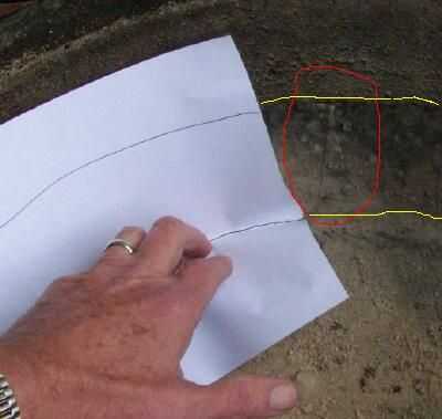 En la foto, el lazo rojo identifica una junta entre dos piezas de metal de hoja. Se puede ver un par de remaches. Las líneas amarillas muestran la parte superior e inferior de la banda del protector lateral de chapa. El libro blanco muestra cómo elaborar un patrón para el corte de las secciones de metal de hoja.