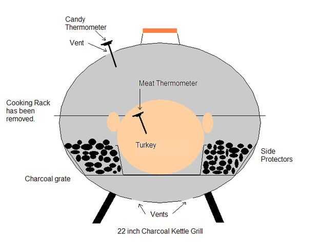 La temperatura bajo la tapa de la parrilla puede aumentar fácilmente a más de 450 grados f el., sobre todo al principio. Utilice los orificios de la parte inferior de estrangulación de aire y bajar la temperatura. Mira el termómetro de caramelo en la tapa de la parrilla. Cuando comienza a disminuir en temperatura Abra los orificios de la parte inferior un poco. El termómetro va a lo que está sucediendo con las brasas y no desea que la temperatura se vaya demasiado baja, o bien. Una temperatura de 350 a 375 grados f el. es casi ideal. Trate de no dejar que la temperatura baje de 325 grados F.