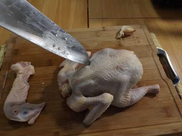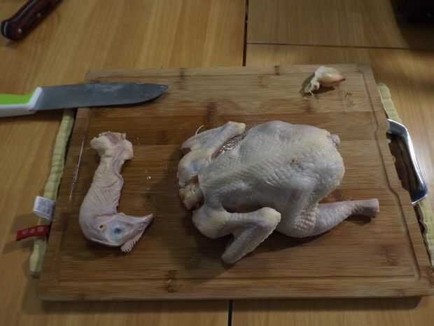 Con qué clase de pollo que te cocina cuadrados lejos, es hora de conseguir listo para cocinar. Ahora aquí en China se puede a menudo ver aves sirven 'cabeza en'. Prefiero quitar la cabeza, pero que no afecta a cosas demasiado si usted lo deja encendido. Ahora, si usted está comprando uno de los mencionados asador de pollos no es algo para preocuparse. Sin embargo, si el pollo viene con una cabeza o un cuello debe guardar para la sopa (más sobre esto al final).