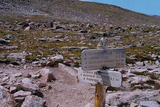 Paso de granito encuentra dos millas más allá del cruce de lago del abismo.  El camino de suciedad de las transiciones a las rocas machacadas y comienza otra subida gradual por la ladera, de morrena de molinos.  La imagen de abajo muestra la condición del camino a través de molinos de morrena, mirando hacia atrás hacia el cruce de lago del abismo.  Una vez que han atravesado dos millas a través de la cuesta que se llega a paso de granito (12.000').  Las bifurcaciones del camino una vez más en este punto (ver segunda foto); Tome la izquierda esta vez.  Los zigzags de la pista hasta otra vertiente por una milla antes de llegar al campo de boulder.  La horquilla derecha lleva a un camping que es popular para la gente que pase dos días en la caminata y no quiere gastar gran parte de la caminata en la oscuridad.