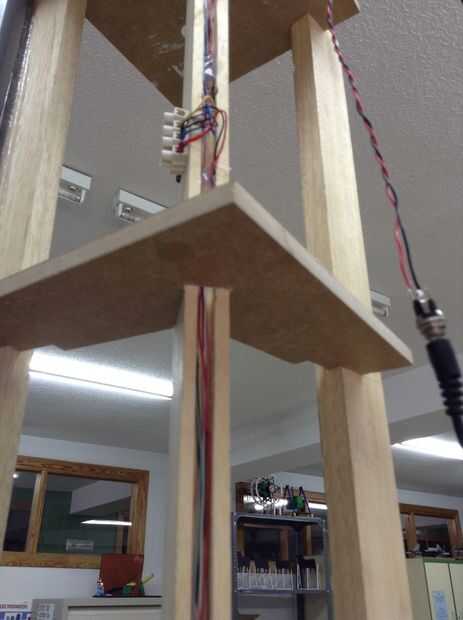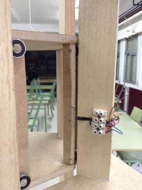Un sensor hall (capaces de detectar campos magnéticos) es el hardware que envía señales al microcontrolador (Arduino) para parar en el piso elegido. Asegúrese de que estos sensores están colocados correctamente: la plataforma y la cabina están al mismo nivel. Una cavidad del Pilar le permite mantener los cables en línea.
