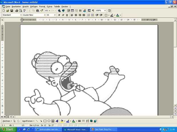 Courir New, tamaño 10 o 12. Teclee sobre la imagen, línea por línea. Para el fondo simplemente use espacios. Para áreas ligeramente coloreadas como uso Letras! o l. Para las áreas normalmente coloreadas uso letras como C, E o F, de color oscuro utilice Ms y Ws. Para los bordes se puede utilizar (,), V, A, Y, d, b y así sucesivamente. Tratar de atrapar la imagen con las letras.