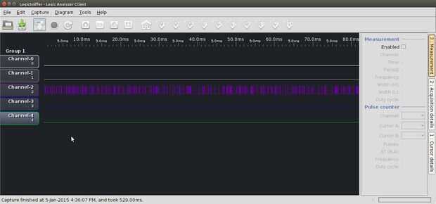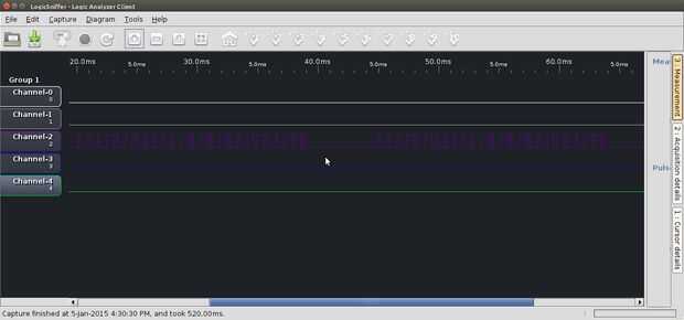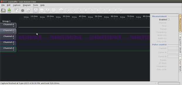 Permite probar la captura otra vez pero esta vez hacerlo manteniendo pulsado uno de los botones del mando a distancia. Ahora debemos tener algo de información. Debería ver un patrón que se repite como envía la señal de una y otra vez. Si ampliar el patrón es lo que hemos sido después. Esta es la señal del es ser enviado por el transmisor y ahora está siendo recibida con usted es receptor de $2,00 de ebay. Con esta información y un transmisor (puede haber llegado con el receptor) podemos conectar el transmisor a un microcontrolador y controlar el receptor de la pared. Eso es otra historia.
