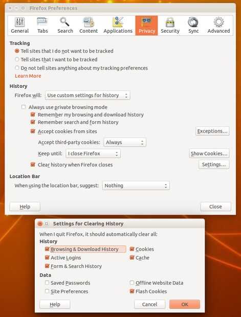 Es donde el "Borrar historial cuando Firefox se cierre".