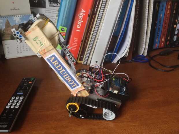 Este robot puede ser controlado por un control remoto de TV y puede ser programado para realizar diferentes tareas. Utiliza un Arduino y se pueden construir para menores $125. Este robot fue hecho para un concurso para la Olimpíada de Ciencias. Fue utilizado para recoger objetos de diferentes tamaños y pesos. Es un divertido proyecto para experimentar el lenguaje de Arduino y programación. Este robot puede utilizarse como una plataforma base para proyectos más avanzados como añadir sensores y la construcción más grande para proyectos más grandes.