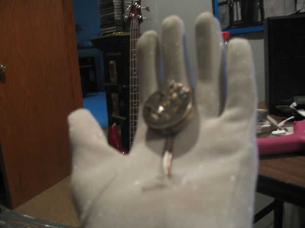 Lo que hice para crear mi zumbador fue alambre de un par de baterías de 9v a un condensador de electrolyctic y una momentánea botón interruptor (por lo que pude cargar el condensador manualmente) y entonces había un par pies de cable de altavoz que pasó de dos de los plomos en mi condensador el viejo timbre de alegría para la descarga. entonces corté un pequeño agujero en mi guante blanco para los cables pasar y colocar el timbre viejo. Mi zumbador, se produce un choque muy amable, y luego si una descarga de metal una pequeña chispa.