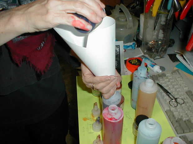 Me gusta mucho mezclar mis colorantes en salsa de tomate estilo botellas de squirt, que es fácil morir. Sin embargo usted decide hacerlo, añadir agua caliente a un recipiente y luego la mezcla algún colorante en polvo. Hacerlo cualitativamente--el tinte más que añade, cuanto más brillantes los colores, aunque hay algún punto de saturación. Una buena regla puede ser 1 cucharada de colorante para 8 onzas de agua.