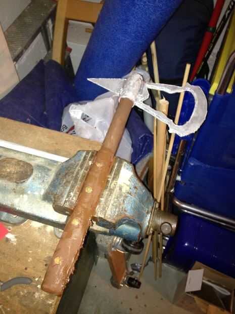 Finalmente tomar sus chinchetas, quitar el colorido de la misma y coloque los cuatro de ellos en el espacio incluso en el mango. Luego tomar su cadena y envuélvalo alrededor de la parte media de la cabeza de tomahawk para hacer una "X" lo amarre, añadir una pluma y anillos de abalorios, tomar fotos y editarlas para picar algunos cabeza y listo!