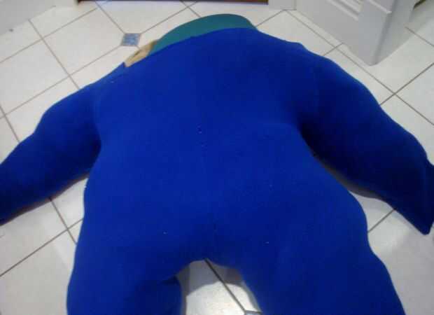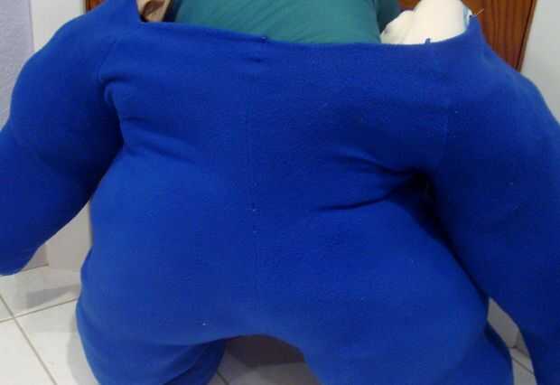 Todas las almohadas de la materia en el mono. Asegúrese de rellenar las piernas bien por lo que puede valerse por sí mismo. O usted podría averiguar otra forma de mantenerlo si no puede soportar. El traje azul iba a ser parte de un traje animal pero era muy grande por lo que se conoce como el "traje de gorda".
