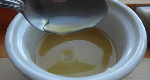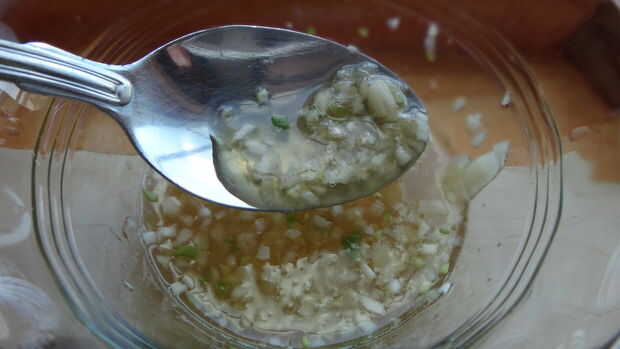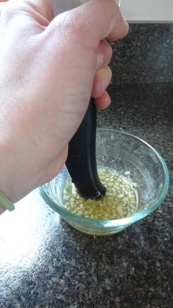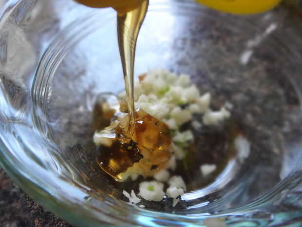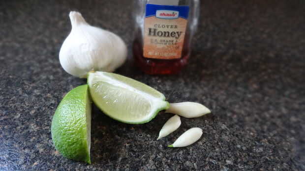 Picar el ajo y añadir a un recipiente, exprima en la cal y añadir la miel. Utilizando un mango de cuchillo, smoosh todo.
