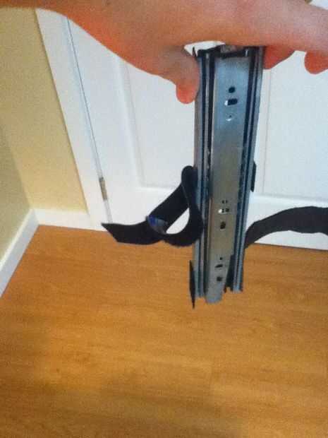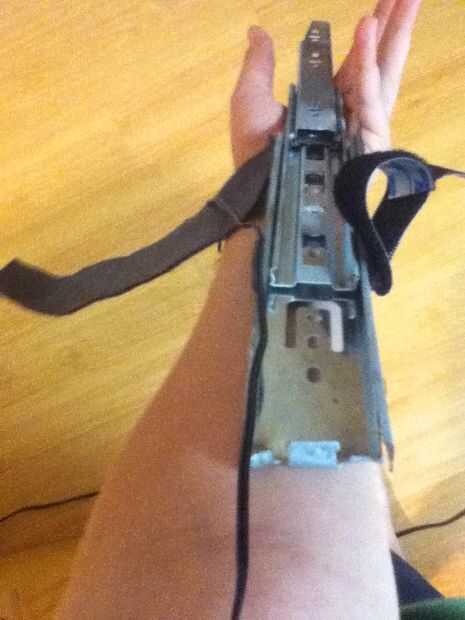 Cortar la diapositiva del cajón donde cabe cómodamente en el antebrazo. Asegúrese de hacer una ficha para parar la diapositiva caiga hacia fuera el extremo posterior. Utilizar el martillo para golpear suavemente los lados de la diapositiva del cajón apretado a la diapositiva del cajón interno (éste bloquea la "cuchilla"). Asegúrese de que no está demasiado apretado. Probarlo para asegurarse de que se deslice la forma que desee. Por último, ya sea pegamento con una muy fuerte epoxy o uso una correa de cinta de pato para hacer las correas del brazo. Ahora lo puede decorar cualquier manera que usted desea.