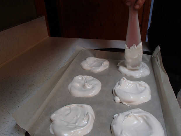 Ponga un pedazo de pergamino para hornear papel en la bandeja para hornear galletas y parte de las claras de huevo para hacer pequeñas alrededor de figuras de crepe-como - con un borde alrededor de cada uno. (Importante - esta llanta es lo que todo que buen relleno caiga justo.)