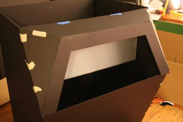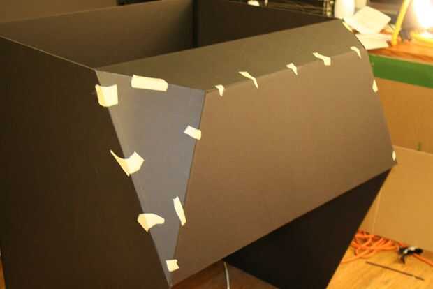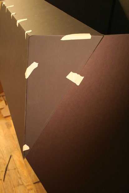 Los paneles traseros y laterales se mantienen unidas por bisagras de cartón pluma para facilitar la portabilidad. La pieza frontal se celebra juntos por la cinta y estarán fijada con cinta adhesiva en el interior una vez su llegada a su destino. Usando el cortador de barbilla crear una muesca en su cartón pluma y darle bordes lisos limpio cuando se los une con otras piezas.