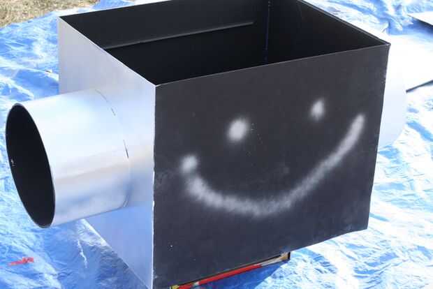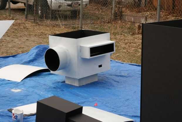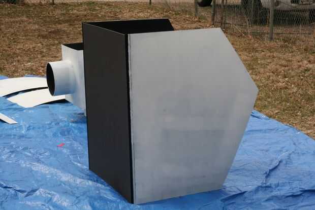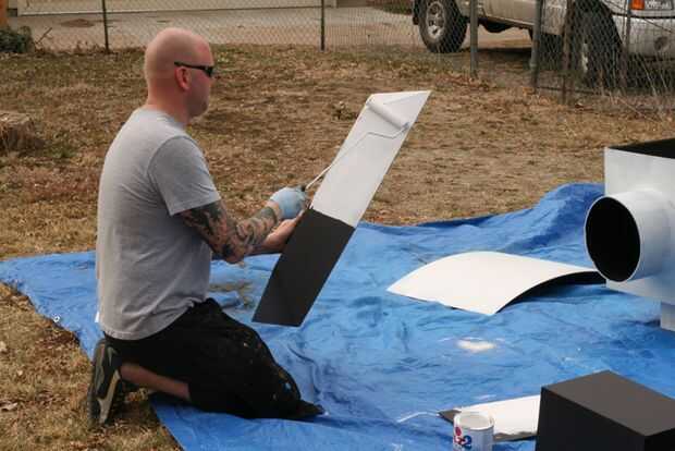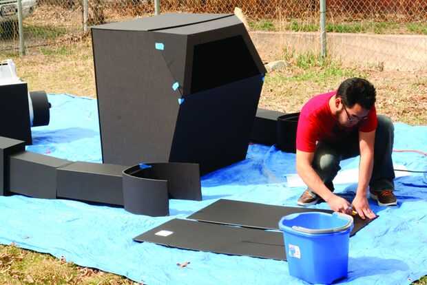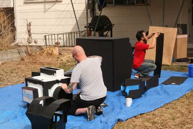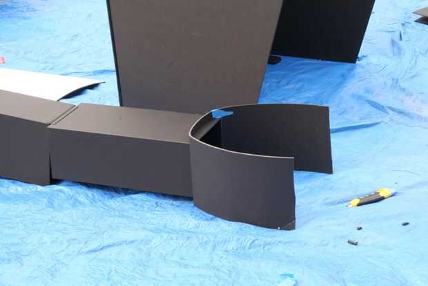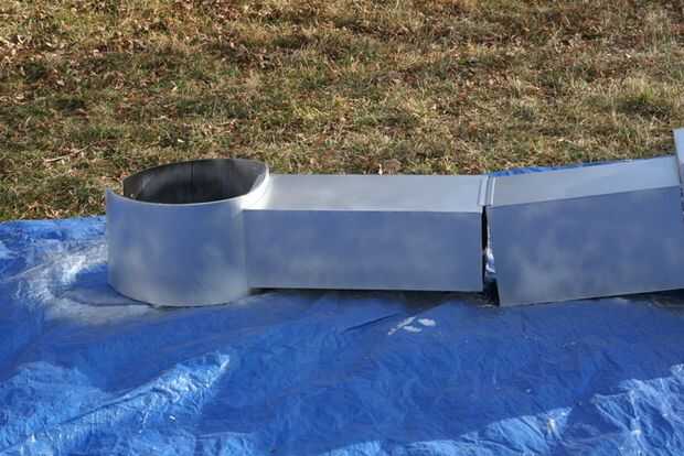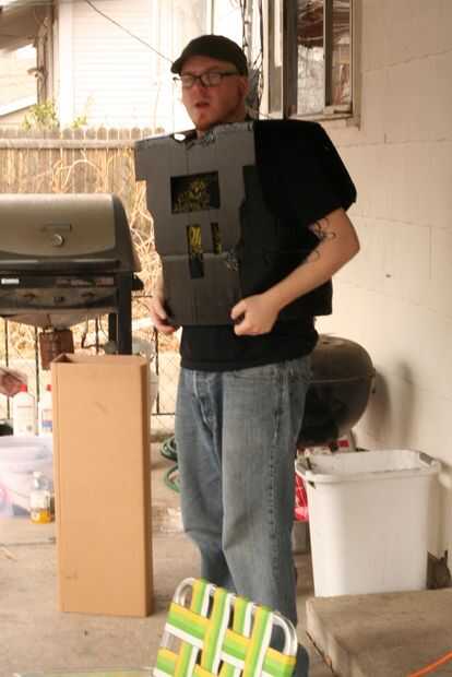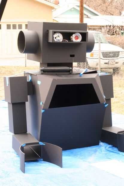 The next day I took the robot to get painted. Puesto que el cuerpo fue construido utilizando bisagras de cartón pluma era más fácil transporte. Una vez que llegaron a una casa de amigos, la Asamblea fue fácil. Se colocó una lona y comenzó el montaje de prueba. Primer primero fue establecido y después de secado 2 latas de super plata se utilizó pintura.