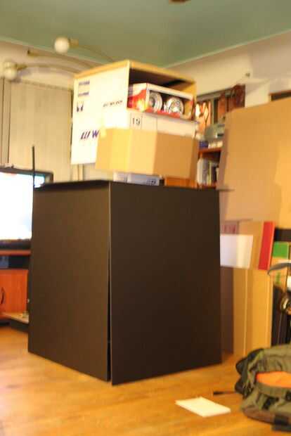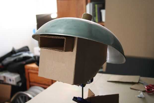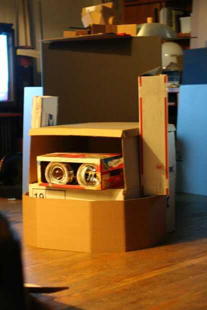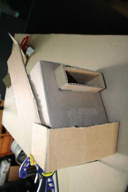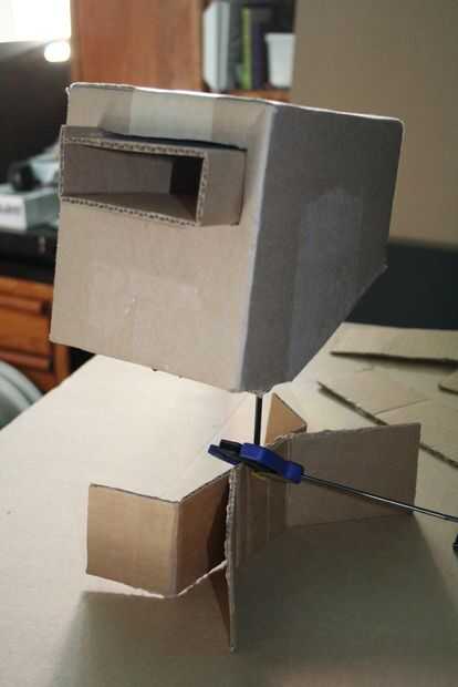 Utilizando una vieja caja de rueda de coche y algunas cajas de FedEx grabó algunas partes para tener una idea general de la mirada. Dependiendo de las cajas que tienes y lo usas, tu robot puede mirar de todos modos elegir.