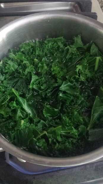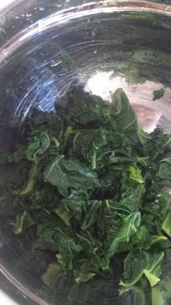 2. Drene el agua fout del contenedor y squeez hacia fuera exceso del agua de la col rizada.