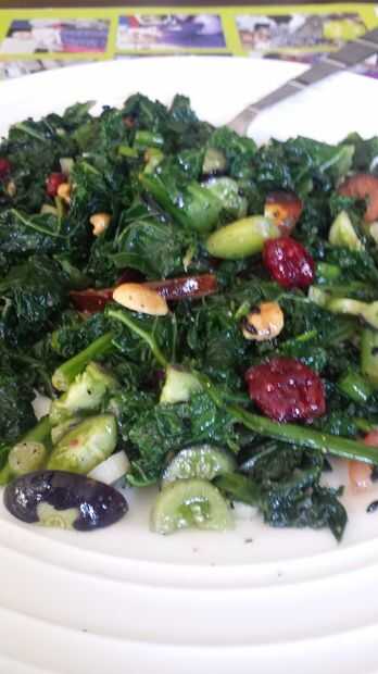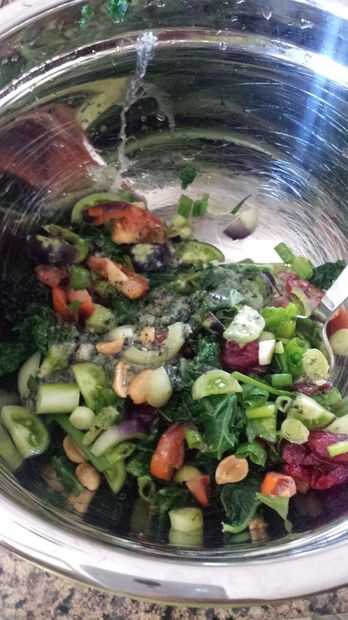 3. poner la col en una ensaladera y añadir el tomate, la cebolla verde picada, cacahuetes y arándano. Mezcle el aderezo de la ensalada nunca cuánto te gusta. Utilice un tenedor o espátula para mezclar todos lo ingrediente en la preparación.