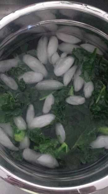 1. en una olla de agua hirviendo añadir la col rizada y déjelo reposar 3 minutos. Para blanch - en un recipiente grande, añadir agua y hielo y luego retirar y añadir la col rizada hervida. dejarlo reposar dos minutos.