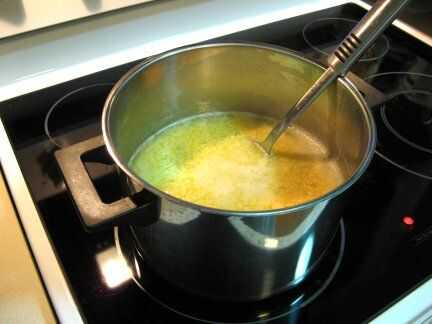 Coloque la olla sobre la hornilla y gire a calor medio. Si se siente valiente, puede iniciar el proceso de cocción con el calor de alta y vuelta hacia abajo hasta media (o media baja) cuando comienza a elevarse de la bandeja de vapor. Su objetivo es llevar los frijoles a fuego lento suave (no hervir!) y a guardar de la quema en la parte inferior de la cacerola. Usted probablemente tendrá que agregar agua caliente de vez en cuando, para que la consistencia quede casi caldoso. Se espesa la mezcla en la etapa final.