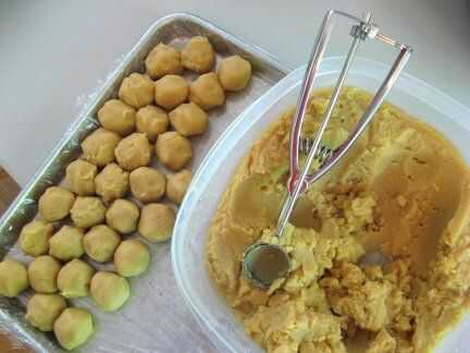 Poner plástico sobre una bandeja (cualquier tamaño cabe en el congelador) y forma el grano pasta en bolitas, sobre uno y un cuarto pulgadas (o menos, si lo prefiere) de diámetro. La cuchara en la foto es una bola de galleta y medio pulgadas, pero puede utilizar una cuchara o cualquier cosa que funcione para usted. Cuando las bolas están completas, cubrir el molde con otra capa de envoltura de plástico y colocarlos en el congelador hasta que esté firme.