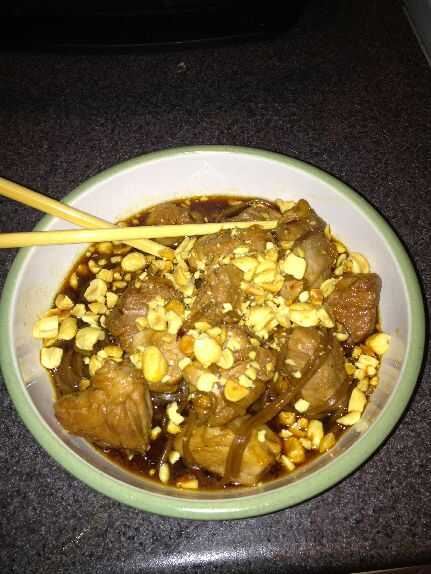 Añadir los tallarines a la mezcla de carne de cerdo, mezclar, servir con cacahuetes