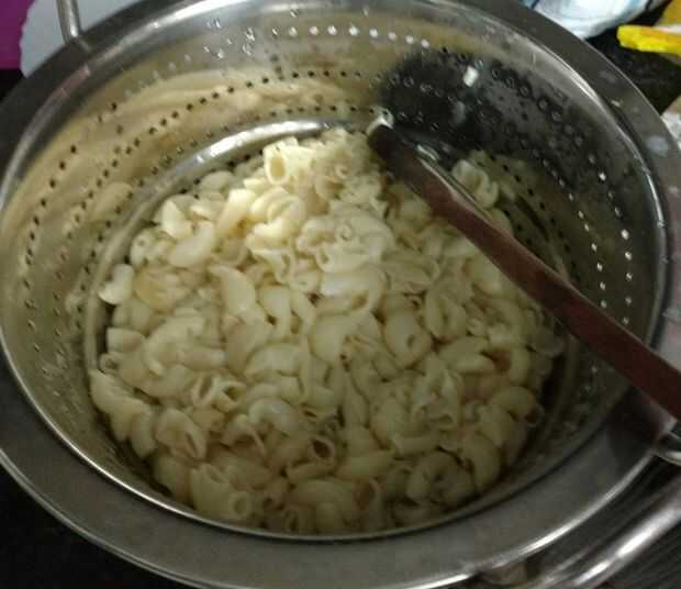 Cocinar la pasta según las instrucciones del paquete. Cuando haya hervido la pasta para el grado deseado de firmeza, enjuague bien con agua fría y escurrir. Tarda unos 7 minutos en total para cocer y escurrir la pasta.