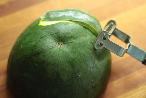 Paso 2: Pelar la parte exterior de la sandía, dejando la corteza verde. Luego, cortar en cubos