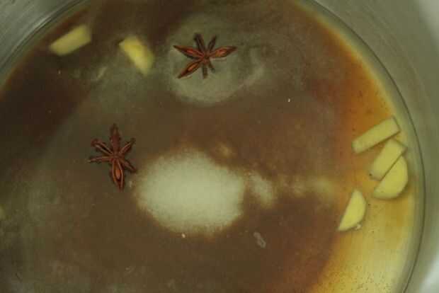 Paso 3: Para la salmuera de conserva en vinagre, añadir agua, vinagre, jengibre, anís, azúcar de coco y sal en una cacerola. Calentar a fuego lento y revolver hasta que el azúcar se disuelva.