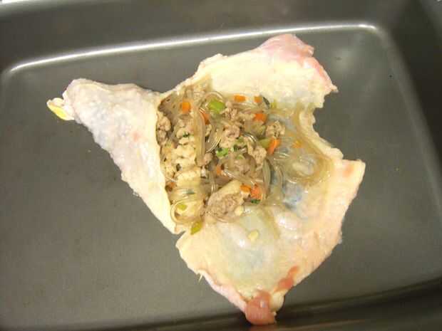 3. Coloque la piel del pollo en cacerola y añadir el relleno cocido.