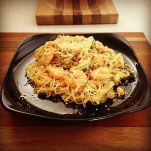 3. saltear verduras con jengibre, ajo y aceite (si usando pollo rehogar el pollo primero y luego agrega los vegetales) brevemente a fuego medio alto, agregar camarones, brotes y los fideos y saltear un par de minutos