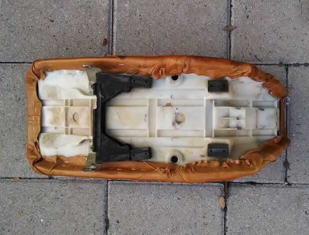 Ahora que la espuma se dirige, podemos comenzar el cuero que cubre el proceso. La idea aquí es que la chaqueta tan estrecha como sea posible sobre el asiento y grapas en su lugar. Grapa la parte delantera y trasera para asegurar que la chaqueta se centra. En mi caso, el cuello de la chaqueta de montar en el muy delantero del asiento. Ahora Estire los lados alrededor a la parte inferior de la bandeja y les de la grapa como usted trabaja su manera alrededor del asiento. Que tenga que hacer algunos plegado y corte de material en exceso a medida que avanza.