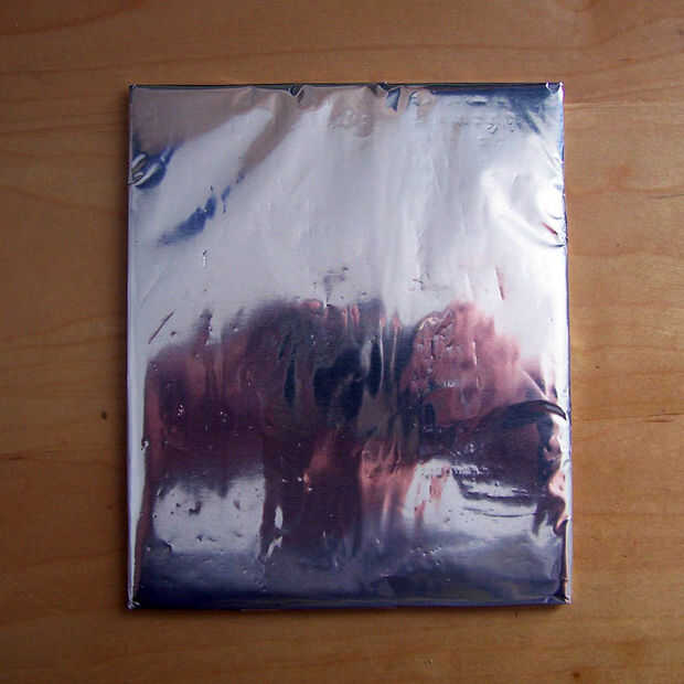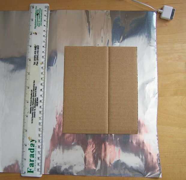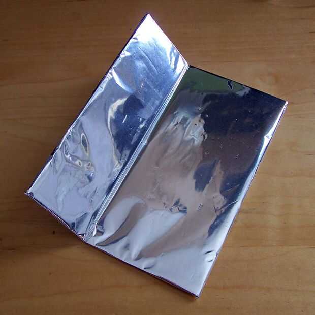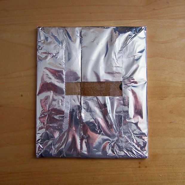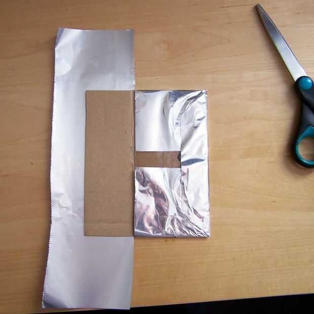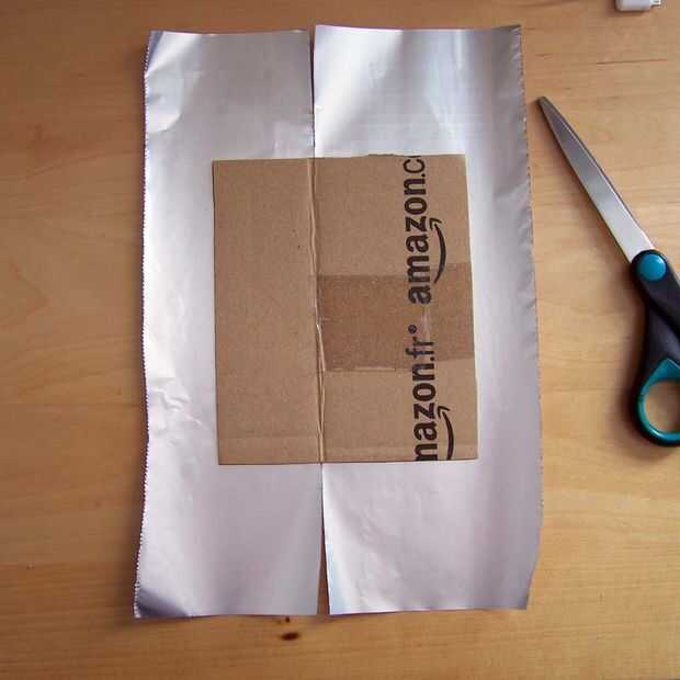 Colocar una bonita hoja plana de papel de cocina, manteniendo tan suave como sea posible aumentar su reflectividad. Tener en cuenta que más papel de cocina tiene un lado brillante y un lado mate - Asegúrese de que el lado brillante es cara abajo, por lo que va a ser en el exterior cuando nos pegamos el papel a la cartulina.