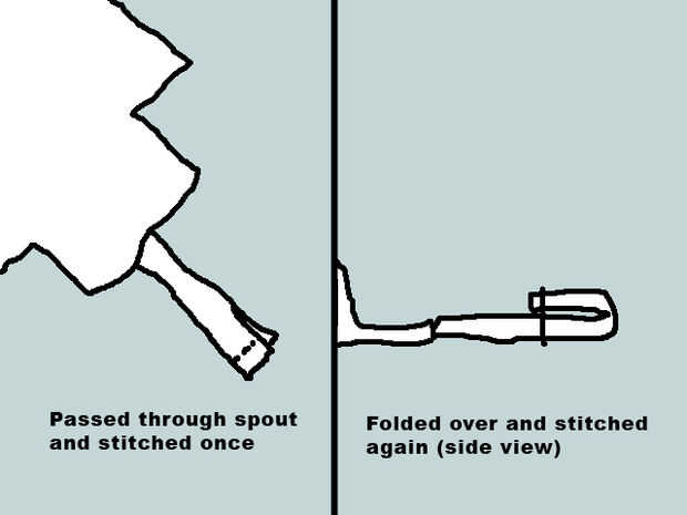 Lo ves, estas tiras de paso a través del mango en un lado del corazón de lona la lona y entonces pasan a través de la manija correspondiente en el otro lado del corazón inflable. Tire de ambos extremos a través del agujero de aire grande y plana los ponen uno junto al otro. Coser ambos extremos juntos. Luego doblar encima y coser otra vez para reforzar la costura. Hacer esto para todos los tiradores a partir de los que más alejado de la boquilla de aire grande y terminando con el más cercano.