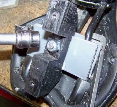 pinté el pino 1 x 2 negro.  Añadir la segunda pieza de PVC y 1 x 2.  Sostenga la cabeza del tornillo con un destornillador de compensación.  Gire la tuerca de bloqueo hasta que las piezas encajan perfectamente, pero no en exceso.  Podría utilizarse una arandela bajo la tuerca.  Mantenga el sostenedor de botella sobre el 1 x 2.  Marque los orificios y perfore.
