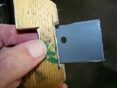Corte una pieza de pino de 1 x 2 pulgadas a 3 1/2 pulgadas en longitud.  Marque el punto medio de su longitud.  Alinee el agujero en el PVC con esta marca.  Marca el 1 x 2 y la entrada al lado que se muestra a la derecha al grueso del PVC.  (La otra muesca de corte se describirá más adelante.)  Corté dos de las esquinas en 45 grados para borrar el asiento y para una mejor apariencia.