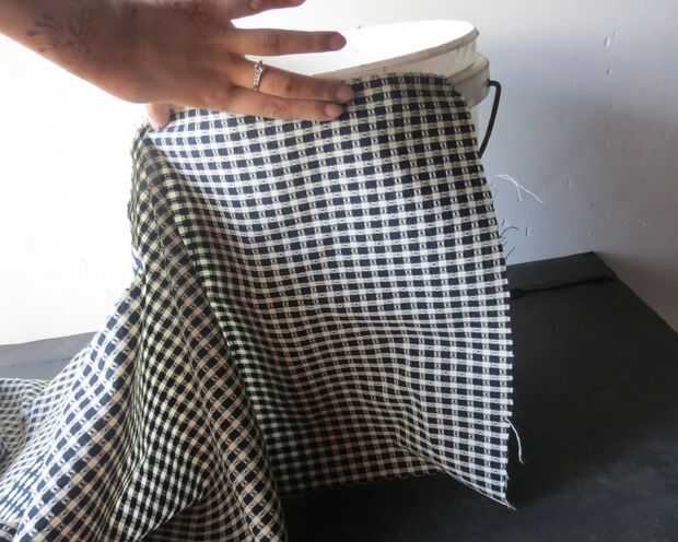 Mida y corte a la tela a la altura del cubo. Asegúrese de que dejar el borde donde la tapa se ajusta a.