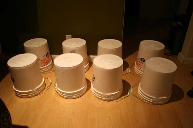 Arreglar los cubos, con el lado abierto hacia abajo, en el área usted necesita estar. Espaciados mina unos 5-8 pulgadas puesto que mis amortiguadores son bastante grandes.
