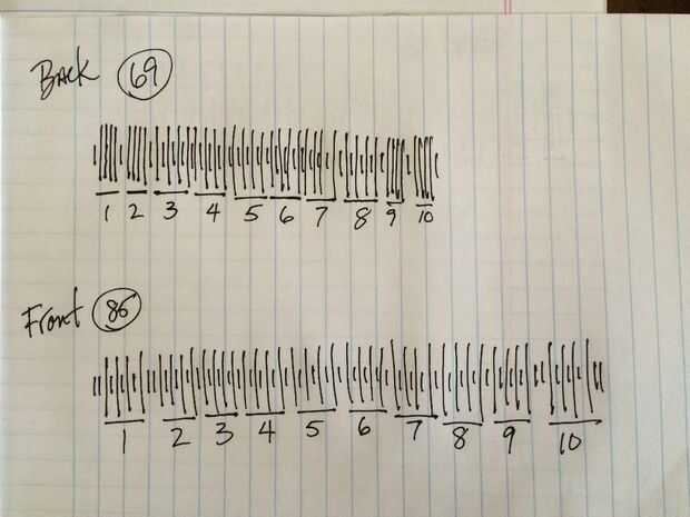 Representan diferencia ancho. Desde el frente es más ancho debe agregar vueltas en sus lados izquierdo y derecho para que el centro del patrón se ejecutará directamente desde atrás al frente. Reste el número de vueltas en toda la espiga posterior a los de la espiga delantera para encontrar la diferencia entre ellos. Dividir esta diferencia por 2. Este es el número de vueltas extras que necesita para compensar a la izquierda y derecha de la espiga delantera por lo que el centro será recta.