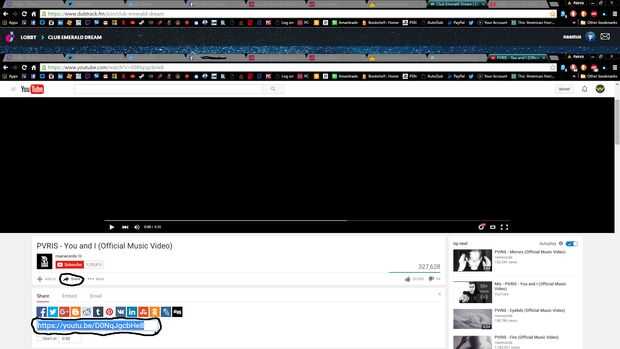 Encontrar una canción en Youtube que quieres jugar. Una vez que encuentre uno haga clic en el enlace "compartir". Esto mostrará un enlace para copiar contorneadas en azul preparado para copiarse. Puedes ver el enlace de participación y enlace url del video en la imagen.