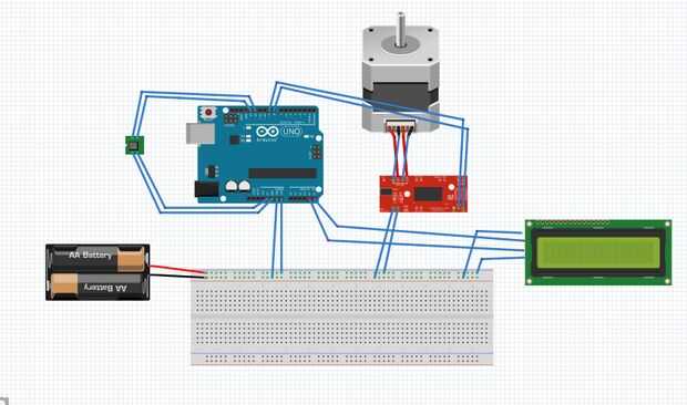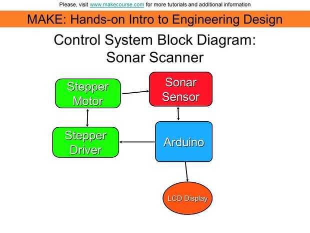 El sistema de control para este proyecto puede verse en la imagen. Tanto el controlador arduino board y paso a paso son alimentados por una batería externa. El adruino controla el controlador paso a paso, el telémetro y la pantalla lcd. La salida al paso a paso va a ser una velocidad constante que se correlacionan a la distancia para obtener una ubicación del objeto. Luego esto mostrará en la pantalla lcd. El controlador paso a paso del alambre en los pines 8 y 9 y el telémetro sonar en los pines 12 y 13. La pantalla lcd es enchufada en analógico 0 y 1.