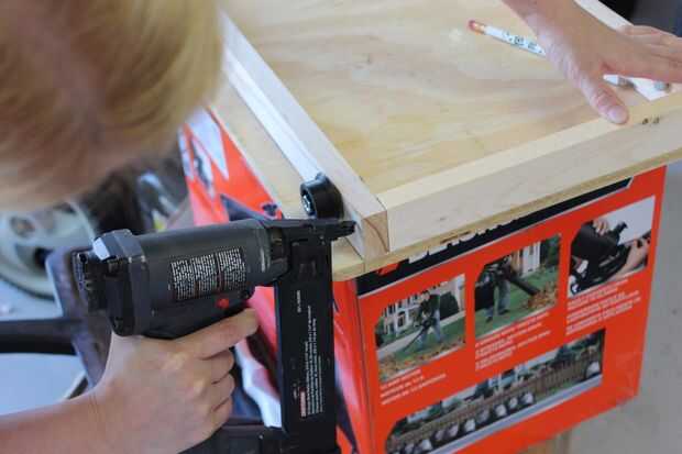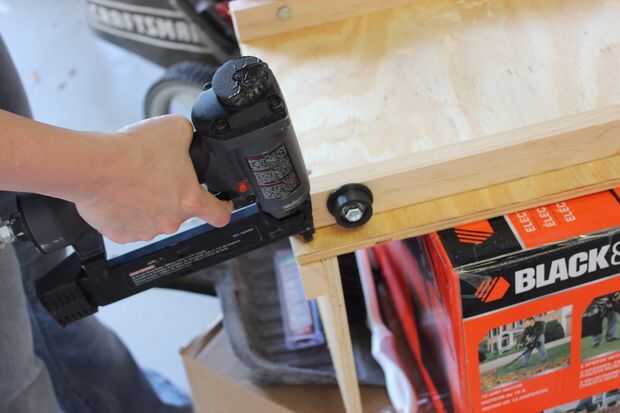 Para hacer la barrera de madera, corte el 1 "x 2'' x 2' pieza de madera a la parte posterior del tablero. Utilice sus handy dandy abrazaderas para sostener al constante madera y fije con una pistola de clavos. Luego, coloque su respaldo frente a la pieza de madera y sujete con una pistola de clavos, con la ayuda de las pinzas. Clave de cualquier punto que te perdiste o sentir necesidades más agarre.