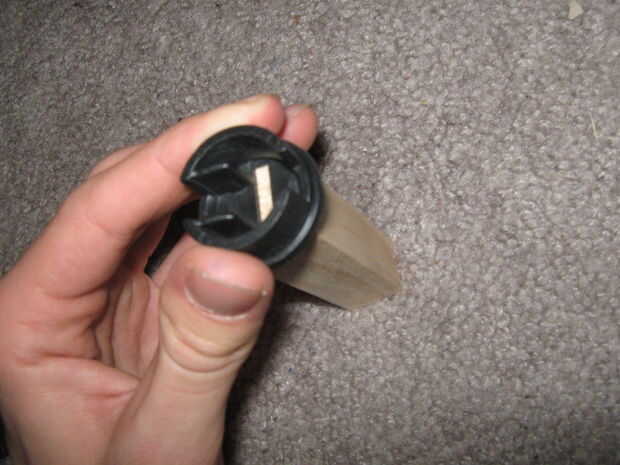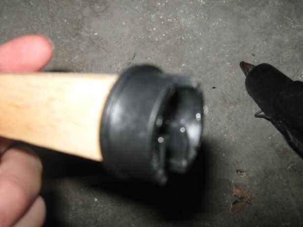 Para colocar la tapa de la alcancía, Aplique pegamento caliente en el extremo del trozo de madera y, a continuación, presione firmemente la tapa de la alcancía en él. La razón por una tapa de alcancía se utiliza, es a causa de su ranura. Fácilmente puede hacerlo cortando una muesca que se ajuste a una manija del cerrojo de madera, apenas estoy usando lo que tengo alrededor.