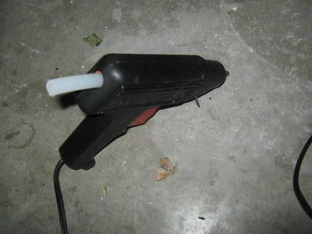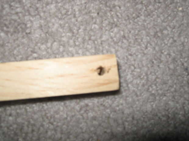Tomar el taladro con la broca de 11/64 y perfore un agujero hacia el extremo opuesto de la madera (final sin surco). Aplique pegamento caliente en el agujero y presione la varilla de metal - pero no a través, creando una forma de "L" (Foto 3).