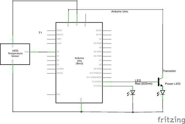 Usé un LED normal y un LED luminoso que tomé de una tira de LED. Conectar los LEDs (para el brillante se necesita un transistor) y sensor de temperatura LM35 a los pines que se muestra en la imagen. Hice un escudo personalizado que un pedido para hacer cosas mucho más fácil, pero usando que un protoboard es siempre una opción