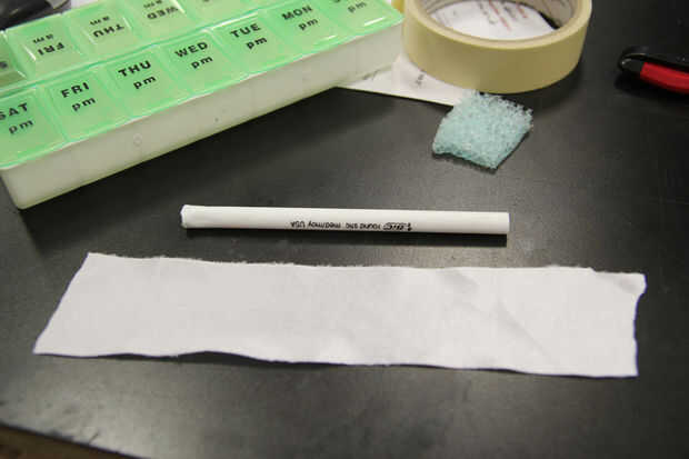 Quite ambos extremos de la pluma y corte una pequeña sección del paño sobre como se muestra. Quiere doble sobre unas 4 veces y no mucho más ancha que el extremo de la pluma.
