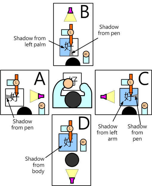 Yo soy diestro pero mi hijo es zurdo, al que le enseña a escribir algunas cosas (la lámpara es colocar en su lado derecho), su mano izquierda siempre la cortina el área de la escritura...