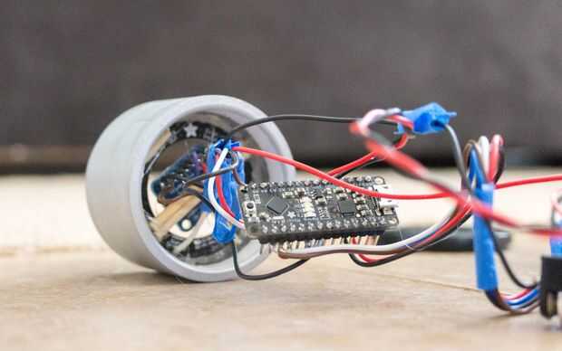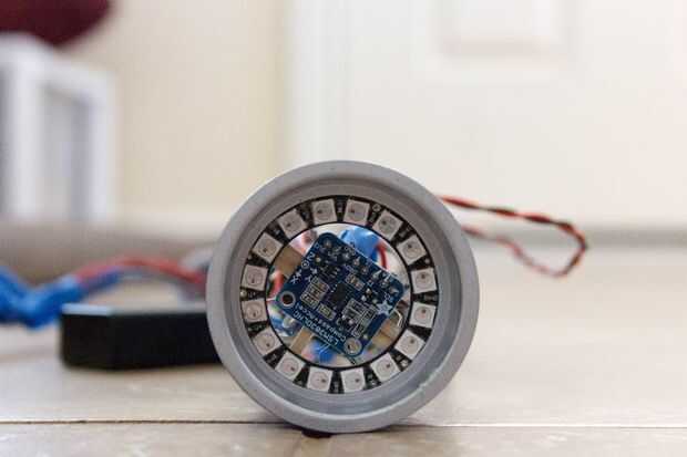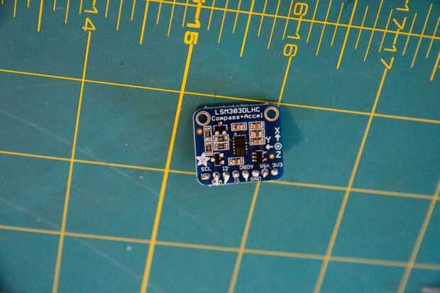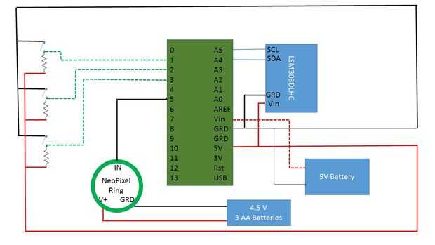 Notas: Utilizar 3 pilas AAA para alimentar el anillo de NeoPixel y una batería de 9V independientes para alimentar el Arduino. El LSM303DLHC se conduce apagado de la salida de 5V de Arduino. El Metro Mini Arduino tiene la opción de funcionar a 3V como hace el LSM303DLHC. No quería ensuciar con que en este momento, sin embargo es posible hacer esto para extender la vida útil de la batería.
