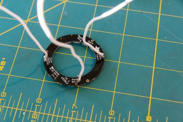 Una vez completada esta parte del cableado del anillo de Neopixel puede montarse en la Unión de 2 pulgadas PVC. Usé pegamento caliente a la línea detrás del anillo para mantenerla en su lugar.