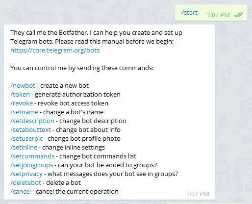 Una vez que su cuenta existe, iniciar una conversación con (el uno bot para gobernarlos a todos). BotFather es una especie de robot principal que permite a los usuarios crear nuevos bots y comenzar una conversación con él sólo tienes que seguir el enlace https://telegram.me/botfather o busque botfather en sus contactos e iniciar una conversación. Una vez que la conversación está abierta hay se ser un botón "/ start" en la parte inferior del chat.